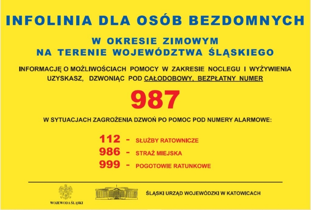 W związku z ostrzeżeniami meteorologicznymi o silnym mrozie informujemy, że pod infolinią numeru 987 bezdomni oraz wszyscy, którzy chcą im pomóc otrzymają informacje o miejscach wspierających osoby w kryzysie bezdomności w województwie śląskim.