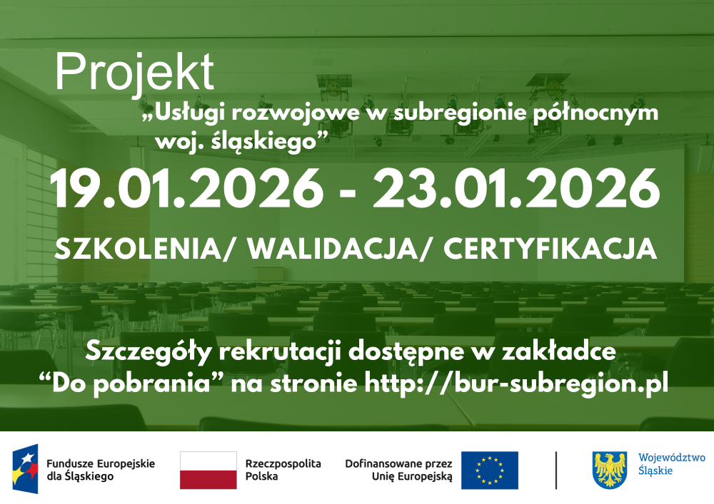 Już 19 stycznia 2026 r. rusza nabór w projekcie „Usługi rozwojowe w subregionie północnym woj. śląskiego”. Nabór dedykowany będzie szkoleniom/walidacji/certyfikacji. Z procesem rekrutacji zapoznać się można w zakładce "Do pobrania" na stronie internetowej projektu http://bur-subregion.pl